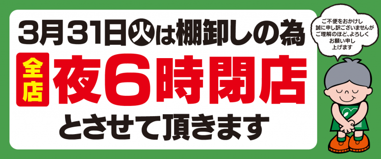 9月30日(月)フタバヤ全店夜6時閉店のお知らせ | 詳しくはこちらをご覧ください。